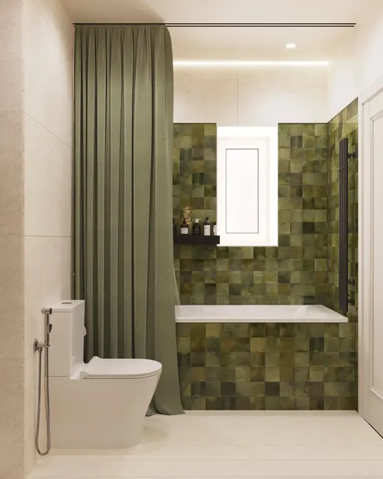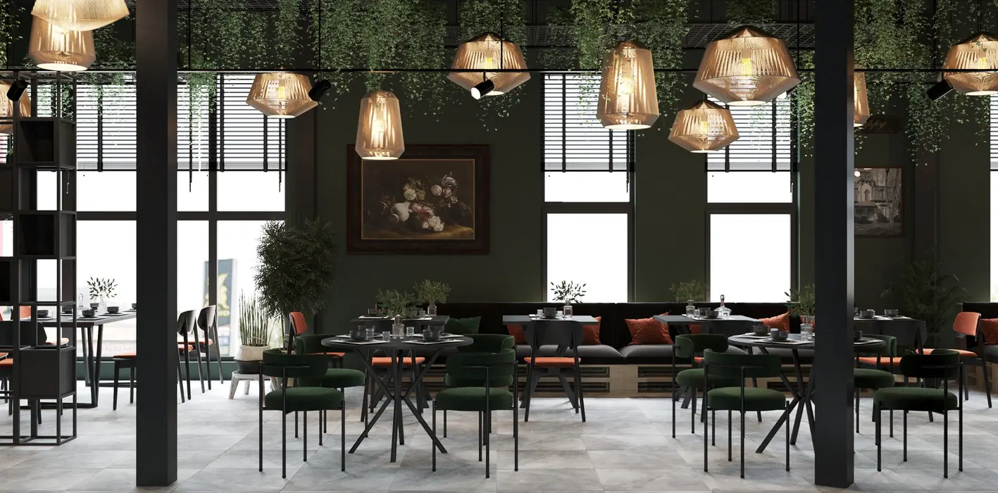Ресторан із темними кольорами та зеленими вставками, що створюють стильну і затишну атмосферу.